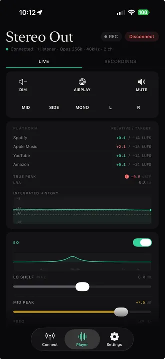 Auxfeed includes Momentary LUFS and Short-term LUFS in the free tier — both update at 60fps per EBU R128, no subscription required. Auxfeed Pro adds Integrated LUFS with tap-to-reset, True Peak dBTP with color-coded warnings, Loudness Range (LRA), and platform presets for Spotify, Apple Music, YouTube, Netflix, and broadcast — running live on your phone while your DAW plays.